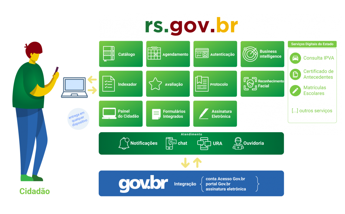 - Painel do cidadão – área do cidadão que centraliza o relacionamento do cidadão com o Estado, oferecendo gestão do perfil, acompanhamento de serviços, avaliação de serviços e notificações.